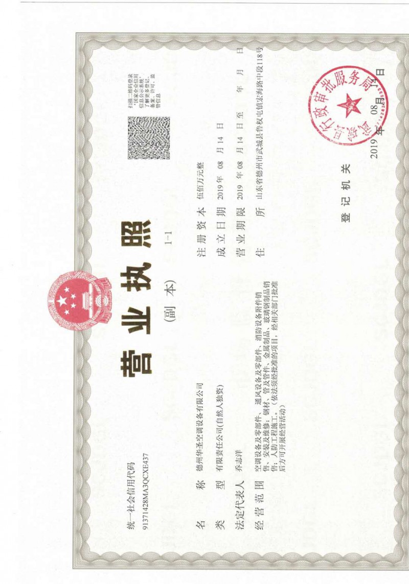 營(yíng)業(yè)執(zhí)照,德州華圣空調(diào)設(shè)備有限公司