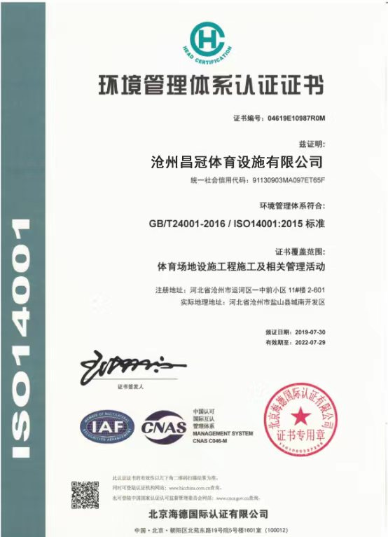 環(huán)境管理體系認(rèn)證證書,滄州昌冠體育設(shè)施有限公司