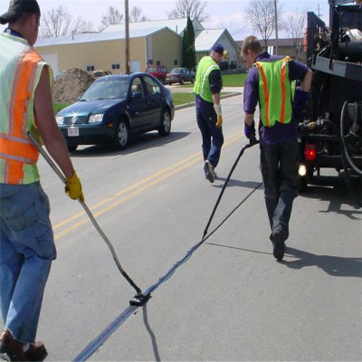 4、灌縫:操作人員手執(zhí)灌縫槍,隨熱氣噴槍之后進行灌縫。灌縫時需選用壓力注射式灌縫設備,確保縫槽內不存留空氣。可選用拉式或拖式走向,完成裂縫密封。
