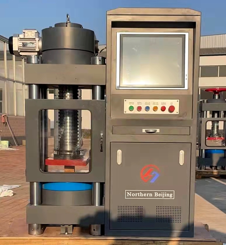 試驗機機體由四根立柱將缸體與上梁連接在一起,在試驗機的上橫梁上裝有調節絲杠,大手輪及螺母絲桿可調整試驗機的空載高度,絲桿下端裝有球座與上壓板。下壓板置與油缸的活塞上,當試件與上壓板接觸時,上壓板球座能自調正平衡、使試件與上下壓板保持水平。下壓板上刻有試件定位用的刻線,做試驗時試件要對準刻線,下壓板下面設有防塵罩殼,防止或減少活塞升降時粉塵進入油缸,損壞缸體或油封。活塞與油缸間設有密封裝置,可以防油外泄,但使用時活塞仍有微量油外泄時,在缸體頂端有環型油槽,并有泄油通道排出,流回大油箱。