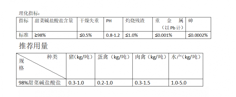 甜菜堿鹽酸鹽,為白色結(jié)晶性粉末,味呈酸甜,具吸潮性,是一種高效、優(yōu)質(zhì)、經(jīng)濟(jì)、廣泛應(yīng)用于畜、禽、水產(chǎn)養(yǎng)殖的誘食促長的營養(yǎng)型添加劑。