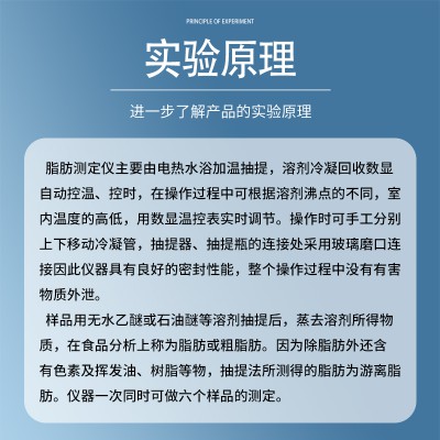 食品油脂索氏提取儀根據索氏抽提原理、用重量測定方法來測定脂肪含量。即在有機溶劑下溶解脂肪,用抽提法將脂肪從溶劑中分離出來,然后烘干,稱量,計算出脂肪含量