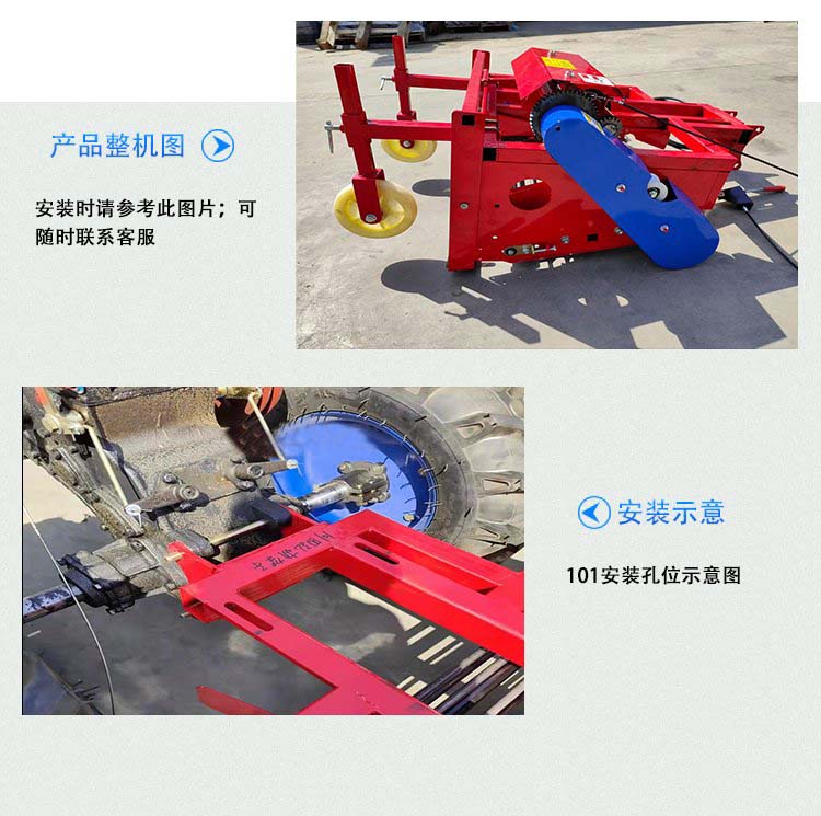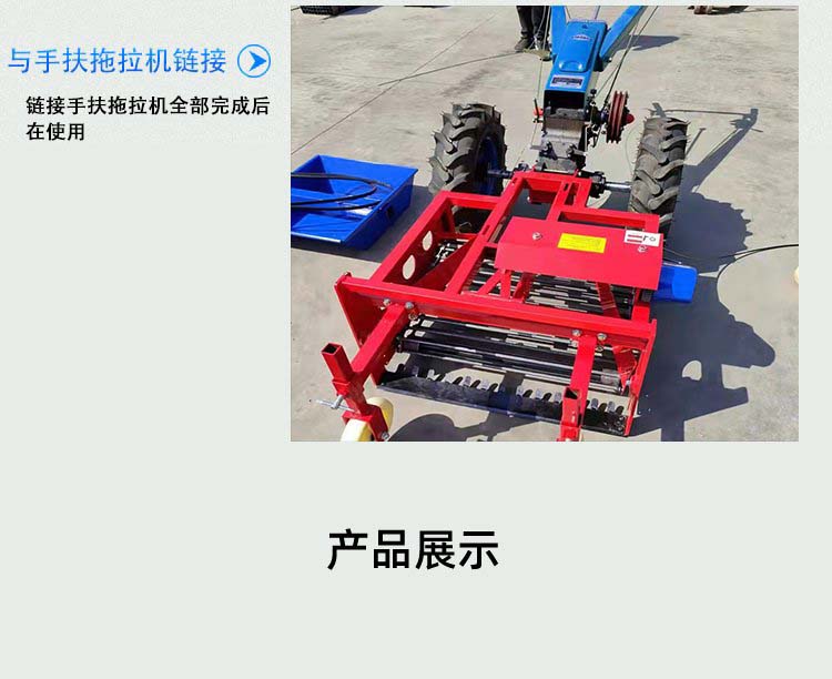 該機(jī)與接口101/151的手扶車(chē)配套作業(yè),主要用于大蒜土豆紅薯花生藥材等地下薯類(lèi)的收獲,成堆等工序。