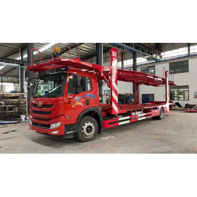 上裝配置:上裝采用T700高強度低碳鋼材制作,進口液壓控制系統,上板長12米,后尾部為1.5米液壓伸縮,下板長9.8米,尾部液壓爬梯,上下板高度2.1米左右,下板離地0.9米。主車四對油缸,駕駛室上方平臺采用沖孔板加網結構,支撐采用700高強度方管,規格60*40.80*40*40*40,厚度都在三個以上,邊梁上200*100方管做立柱割開放油缸,后側片折彎做立柱,外置上平臺升降油缸,上平臺邊梁采用Q315B焊接工字鋼(上8m m中6mm下8mm)網版+沖孔板結構,支撐采用100*5040*4040*20的Q235方鋼結構,防護網用3mm的特制型鋼。