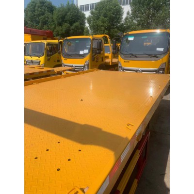 上裝配置:5噸/6噸平板,采用5個厚花紋板,板長5.3-5.6米,寬2.3米,平板可開孔,邊框可用方管或者實心鋼板,雙副梁,8個厚滑槽,選裝后托舉裝置,尾部可選裝液壓翻板。采用雙側聯動操作裝置,配備1個4噸液壓絞盤(25米鋼絲繩),4根捆綁帶,兩個小車,L型抱胎架一對,抱胎筒一對,一個工具箱,2只工作燈。也可選用伸縮板或者普通液壓翻板。可做全落地板,斜板,斜落兩用板。