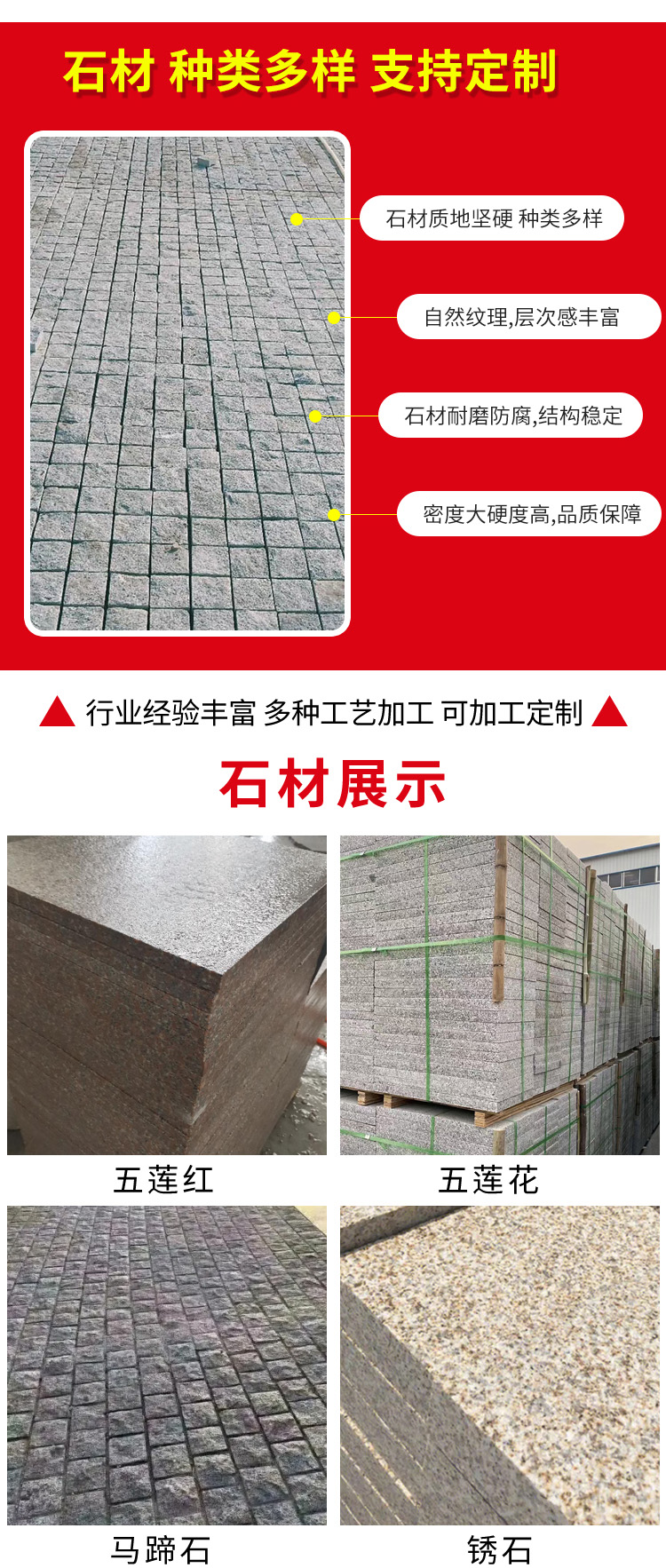 五蓮紅、五蓮花、五蓮灰、銹石、馬蹄石、路沿石等