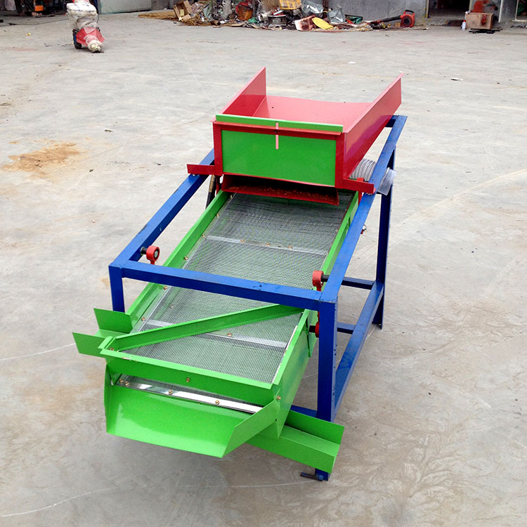 該精選篩為二層篩網(wǎng),先經(jīng)過進料口處風機抽風,直接抽走重量輕的雜葉或麥秸稈,上層篩的初次篩分再把大雜清理過,好的糧食(種子)直接落到下層篩網(wǎng)上,下層篩網(wǎng)會把糧食(種子)中的小雜.小石子.有缺陷的糧食(種子)直接漏掉,完好的糧食(種子)會從出料口篩分出來。該小型清糧機解決了揚場機的功能單一,不能有效去除石子.土塊的缺陷,更能為清理.凈選糧食(種子)帶來滿意的效果。該機有占地小,移動方便,便以維修,除塵除雜效率明顯,能耗低,使用簡便等優(yōu)點。