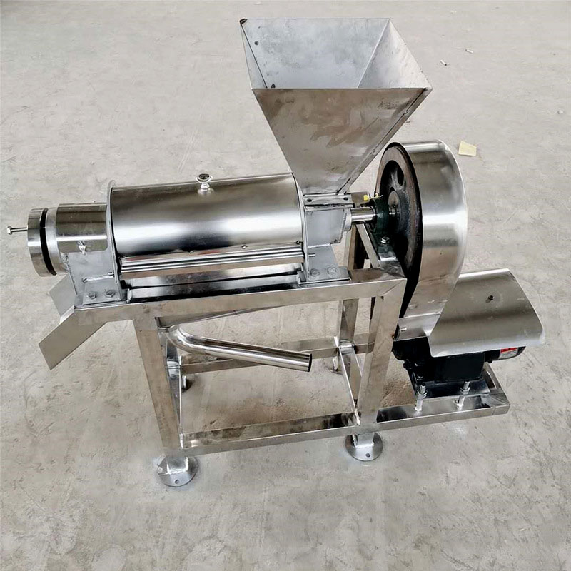 原料加入進料斗中,在螺旋的推進下受壓,其壓榨的汁液通過過濾網流入底部的盛汁器,而廢