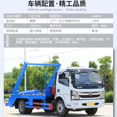 擺臂式垃圾車適用全國通用垃圾斗,分別有地面斗和地坑斗,液壓操作,垃圾斗可自吊上吊下,擺臂一次工作循環時間:60S。該車的特點是貨斗與車體分開,能實現一臺車與多個貨斗聯合作業,循環運輸,充分提高了車輛的運輸能力,特別適用于短途運輸,如環衛部門對城鎮垃圾的清理、運輸等。