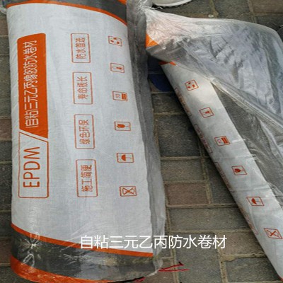 自粘三元乙丙防水卷材系三元乙丙防水卷材與自粘丁基橡膠的復合預制,以自粘橡膠做粘結層的防水卷材。其結合了三元乙丙防水卷材高可靠性和自粘橡膠防水卷材的優良特性。