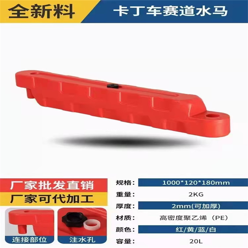 水馬 1、材料采用進口環保線性聚乙烯、進口顏料和添加劑,,可循環再利用; 2、美觀、不褪色,紅/白或紅/黃相間連接使用,警示性高,降低事故發生率。(亦可制作水泥色) 3、顏色鮮明,指示路線清楚明確。可美化公路或城市; 4、中空灌水,具有緩沖性能,能有效吸收強大的沖擊力,大大降低對車輛及人員傷害的嚴重程度; 5、串連使用,整體承受力強大,安裝穩固; 6、兩個灌水孔、一個排水孔,兩人即可完成安裝和拆遷,方便快捷,無需使用吊機,節省搬運成本; 7、用于人員群集場合的分流和防護,可減少警力; 8、保護路面,無需路面施工即; 9、可成直線或弧線擺放,靈活方便; 10、適合道路、分叉口、收費站、建筑工程及大小型人員群集的場合使用,能有效起到道路分隔, 人員和車輛分流等作用。 規格:長度/L:1060mm,高度/H:600mm,上寬/W:120mm,下寬/W:280mm; 重量:凈重6kg,裝水重量:66kg;拉伸強度:16.445Mpa;沖擊強度:20KJ/cm²;;斷裂伸長率:265%;