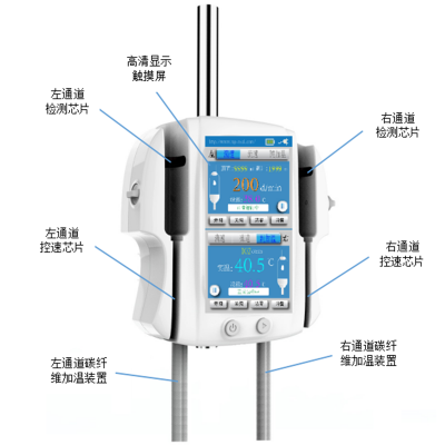 3、智能微電腦控制三腔碳纖維加溫條 2 分鐘內(nèi)快速升至設(shè)定溫度,加溫條長度高達(dá) 1.2 米,與各種型號輸注管路適配,同時保證流出液體的溫度恒定,三重升溫保護(hù)機(jī)制,全方位保障輸注安全。