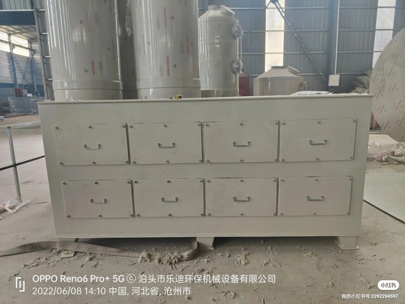 本裝置采用煤基柱狀活性炭或蜂窩狀活性炭選用精制無煙煤為原料。外觀呈黑色圓柱狀顆粒,具有合理的孔隙結構;良好的吸附性能,機械強度高、可反復再生等特點。用于有毒氣體的凈化、廢氣處理、工業和生活用水的凈化溶劑回收等方面。活性炭吸附裝箱是一種結構合理、風阻系數低、凈化效果好、安裝簡單、維護方便,使用壽命長的凈化裝置。