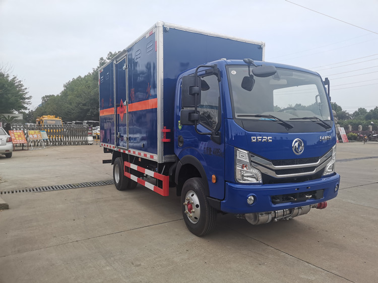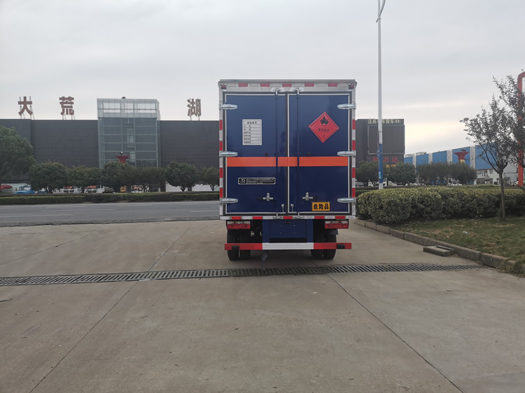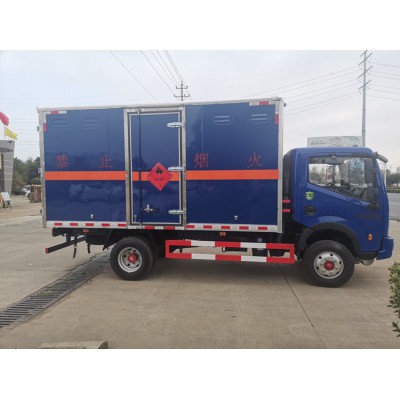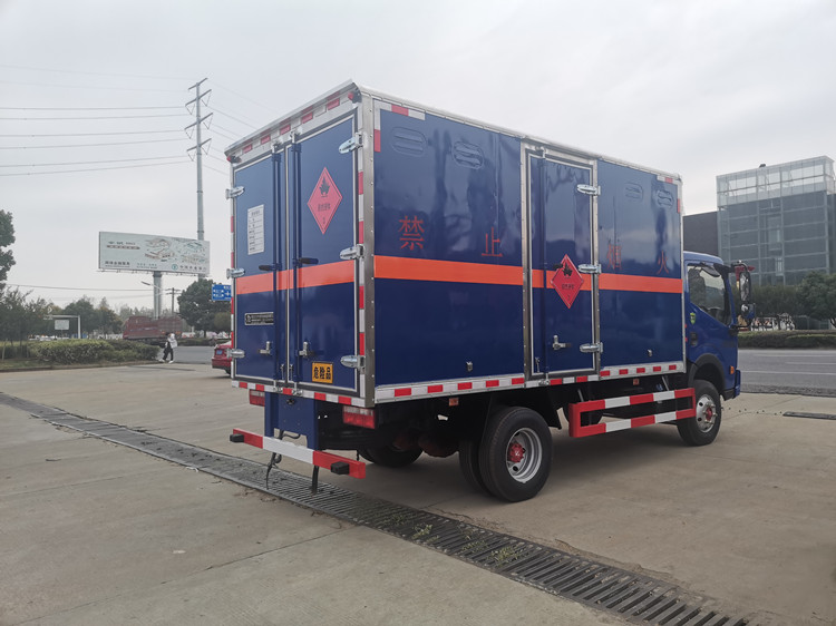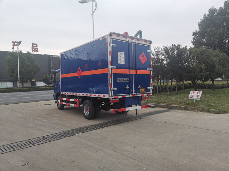 上裝部分:廂體內尺寸:4100×2000×1850, 廂體為雙層金屬結構,外板采用靜電屏蔽效應的冷軋鋼板,中間附以阻燃泡沫,內飾采用鋁板,廂內兩側上方安裝防雨通氣孔。底板為防滑花紋板3mm(上鋪設防靜電膠皮),廂體右側開一個單開側門,廂內安裝固定運載物的臥環,貨箱內部帶防燃煙霧報警器,門框加裝防盜報警感應器。整車國標反光標示及警告標志 (隨車工具,滅火器,三角頂燈,危險品標識,拖地靜電帶),其他按照公告標準制作。