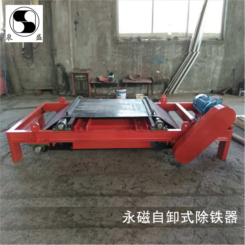 自卸式永磁除鐵器在懸掛式永磁除鐵器的基礎上加裝了一套自動卸鐵機構,在工作時,懸掛在輸送設備上方的除鐵器,通過強大的磁力,吸出混雜在物料中的鐵雜質,被吸到除鐵器底部卸鐵皮帶上的鐵雜質,由卸鐵皮帶拋入集鐵箱中,達到自動清除的目的。自卸式永磁除鐵器能自動清除吸附的鐵雜質,適用于含鐵較多,時常卸鐵的環境。