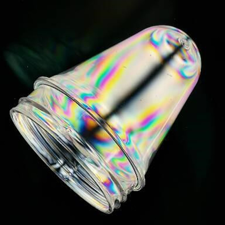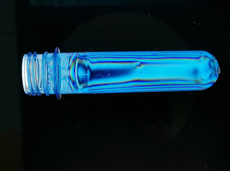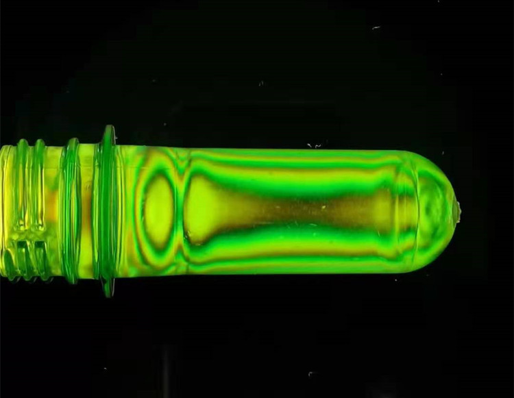2.當瓶坯置于應力儀中45度角時可以觀測到瓶坯邊緣處彩色的雙折射條紋,